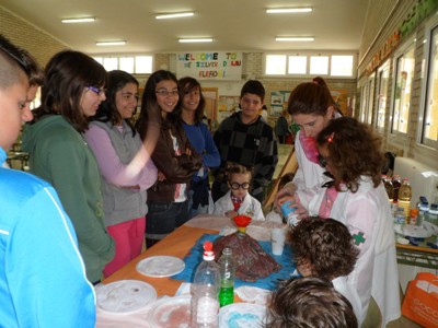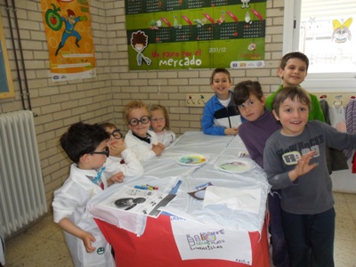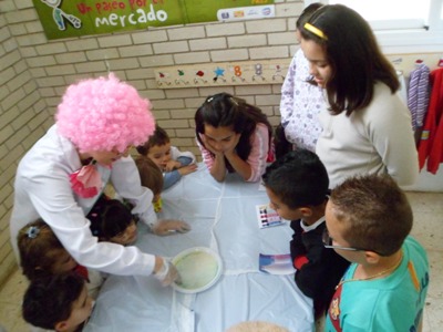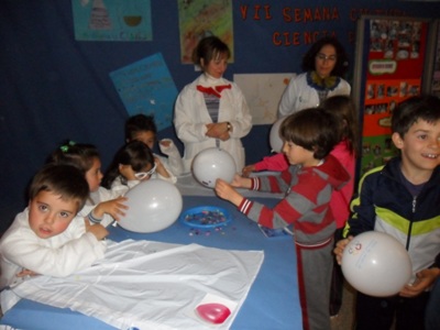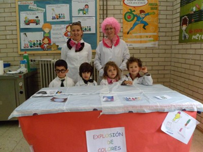 Se hicieron talleres con algunos de los experimentos que ya se habían trabajado en el aula. Cada clase de infantil (3, 4 y 5 años) -con la especial colaboración de las madres-, explicaron a sus compañeros y compañeras de E. Primaria la explosión de colores, capas de sustancias, el poder de los electrones, burbujas psicodélicas, isla mágica y sorpresa sorpresa.